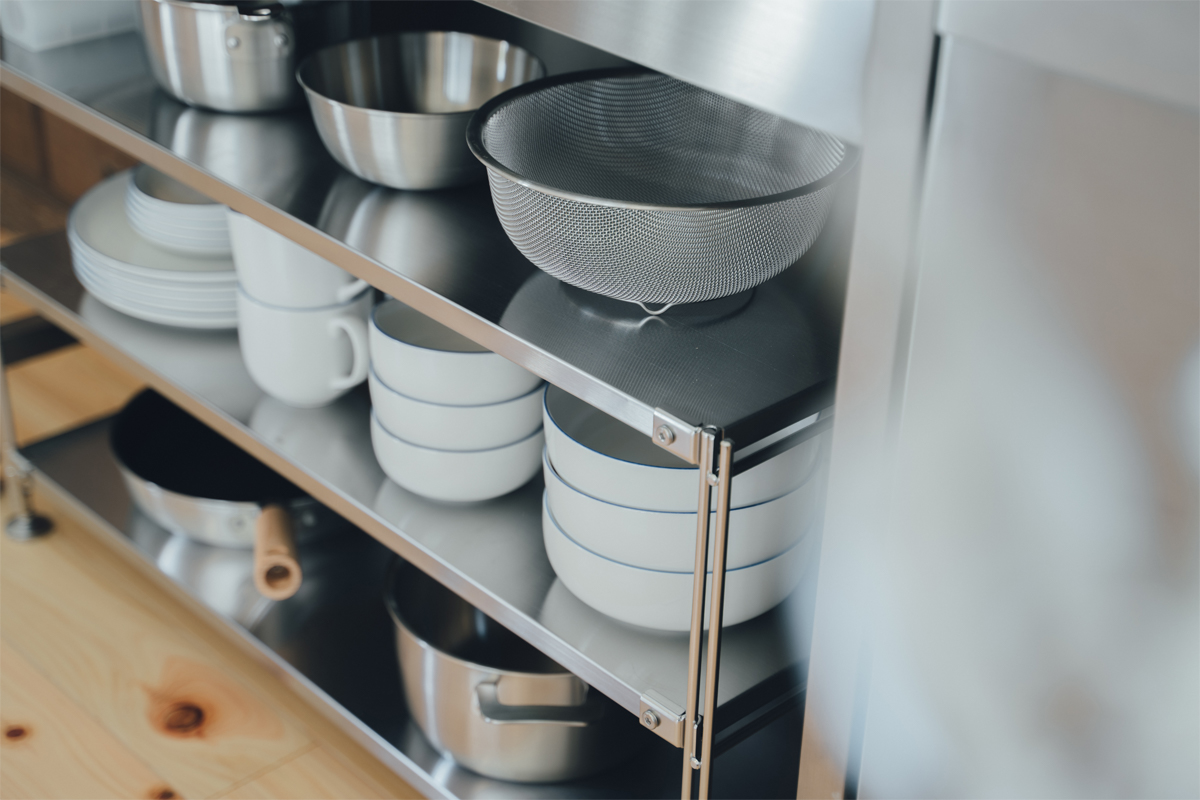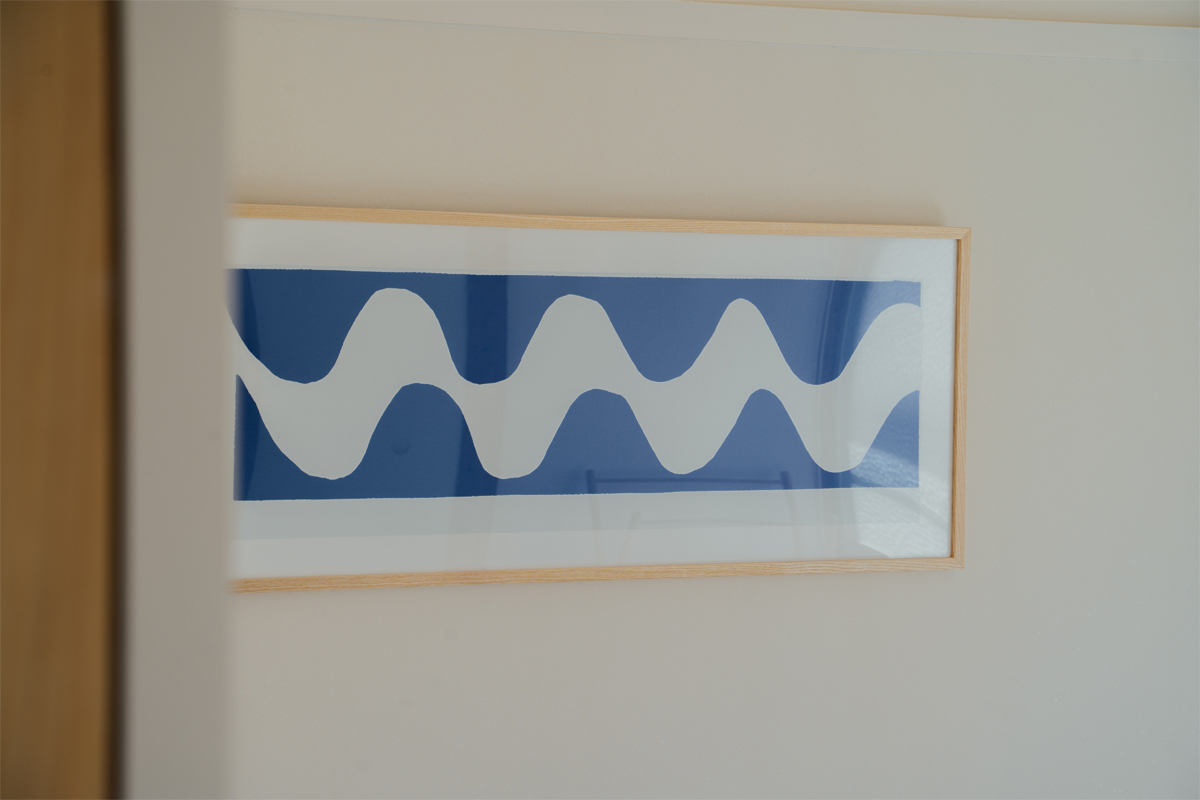 離れに関しては、宿泊施設として全面的にインテリアコーディネートを施している。家具や寝具、収納、キッチン用品からアメニティまで無印良品の質の高い商品で構成し、効率的でありながら落ち着きのある空間を実現。食器棚は修繕前の母屋で使われていたものをアップサイクルして再利用することで住まいの記憶や懐かしさも融合し、トータルで雰囲気を醸成している。さらに各部屋には、インテリアブランドIDÉEの商品から、四万十川をイメージさせるブルーを基調としたアートを添えることで、地元の自然を想起しながら豊かに心の余白を満たせる工夫も施されている。
