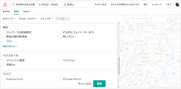 右の地図を動かすと、エリア内にある物件の1泊の宿泊料金が表示されます。地図は拡大・縮小して、物件を探すこともできます。値段をクリックするとその部屋の写真がポップアップ表示され、それをクリックすると部屋の紹介ページに移動します。