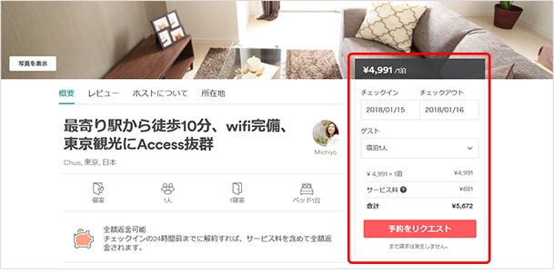 サービス料:Airbnb(エアビーアンドビー)の運営代金として、利用料の5~15%が加算されます。