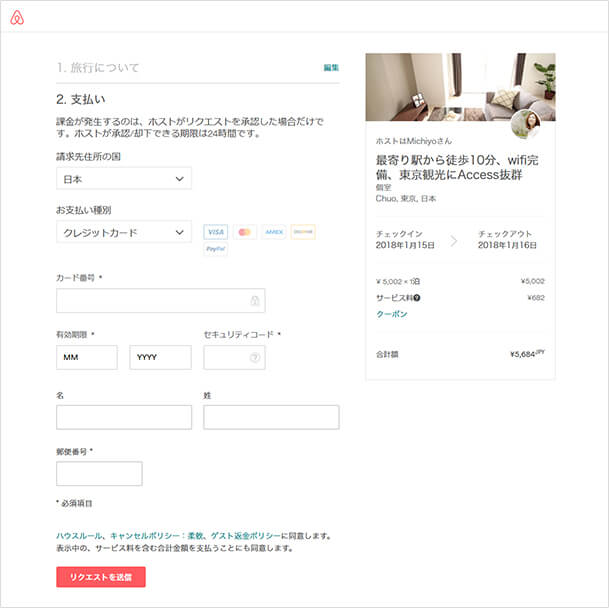 お支払い方法を入力し「リクエストを送信」をクリックします。