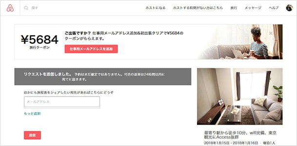 「予約リクエスト」が送信されました。この時点ではまだ予約は確定していません。ホストからの連絡を待ちます。