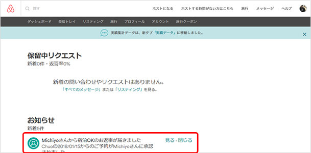 通常は予約申請をしてから24時間以内にホストから「承認」「却下」「問い合わせ」のいずれかのリアクションがあります。