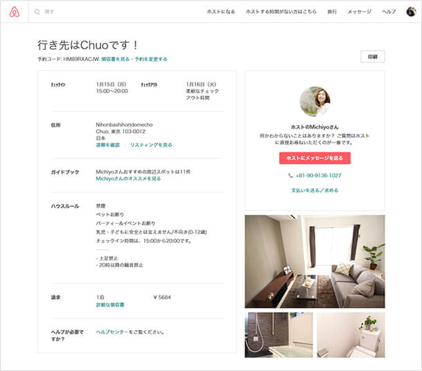 予約が完了すると、その時点で宿泊料金の支払いが発生し、Airbnb(エアビーアンドビー)から予約確認や旅程表がメールで届きます。